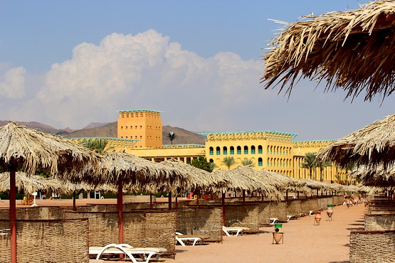 На предыдущей фотографии видно, что отель находится на берегу Красного моря. Вид на пляж с пальмами, бассейнами, зонтиками и лежаками, так и манит к морю. Кстати, из номера до пляжа прогулка не занимает много времени, так как расстояние из самого дальнего номера не более трёхсот метров. Для наглядности публикую фотографию с пляжа по направлению к отелю.