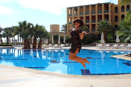 Танюшка в полёте на фоне бассейна, пальм и отеля в Египте